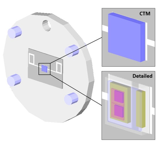 The boundary condition independent accuracy of the CTM was implicitly assured for the three HTC sets that were considered during its extraction. To validate its accuracy for an intermediate HTC set, a final comparison was performed. Both CTM and detailed LED models were simulated independently in a 3D model of the environment that was originally used for the measurement (Figure 5). The LED was mounted on a ceramic substrate, which was itself mounted on a coldplate.