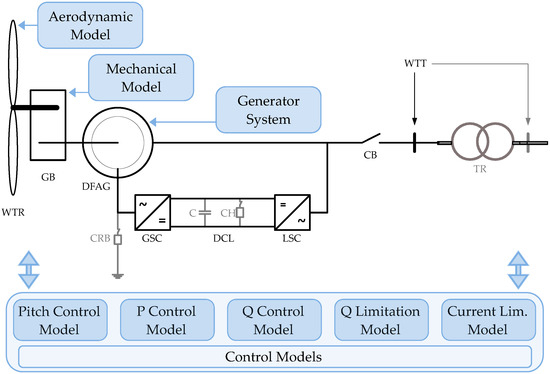 Figure 1 shows a schematic representation of generic Type 3 WT and its control models [20]: aerodynamic model, representing the wind turbine rotor (WTR) and providing the value of the wind aerodynamic power; two-mass mechanical model, representing both the low and high speed sides of the gear box (GB); generator system, which provides the values of the active and reactive current injected into the grid and represents the doubly-fed asynchronous (or induction) generator (DFAG); pitch control model, which adjusts the position of the WT blades through calculation of their pitch angle; active power control model (P Control Model), the main output of which is the active current command; reactive power control model (Q Control Model), which provides, based on the reactive power reference, the reactive current command; reactive current limitation model (Q Limitation Model), which calculates the maximum and minimum reactive power allowed; and current limitation model, which provides the active and reactive current’s limit values. Moreover, the power converter, also shown in Figure 1, consists of the generator side converter (GSC), the direct current link (DCL), the DC capacitor (C), the chopper protection system (CH) and, lastly, the line side converter (LSC). In addition, as mentioned above, some Type 3 WTs include a crowbar protection system (CBR). Finally, the wind turbine terminals (WTT) are connected to the grid through a transformer (TR), and the circuit breaker (CB) may disconnect the WT from the network. The way in which the control models are related to each other may be seen in [6] in more detail.