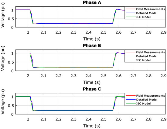 Furthermore, according to Figure 2, which represents the field measurements of the voltage dip and the fault data once applied in both the detailed and generic WT simulation models, it can be stated that the three data series match well and that, therefore, reproduction of the measured voltage in the dynamic simulation models has been performed adequately.