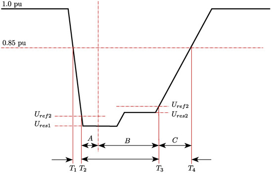 The duration of the comparison window for the application of the validation criteria is 1000 ms, starting 100 ms before the beginning of the fault. On the basis of the information depicted in Figure 3, this 1000 ms time interval starts at [ − 100 ms] and lasts until [ + 900 ms]. indicates the time when the fault occurs at one of the phases for the first time, as the voltage drops below the specific threshold (0.85 pu, also shown in Figure 3). indicates the time when the deepest part of the voltage dip starts (taking into consideration both the reference and residual voltage parameters, and , see [5]). indicates the end of the voltage dip’s deepest part, and depends on and . Finally, is the instant in which the voltage at the three phases is recovered, already above the threshold (0.85 pu).