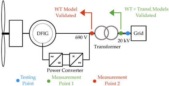 In the case of WT model validation processes, the measurement point may coincide with the testing point, i.e., with the point at which voltage dips are applied in the actual WT by the voltage dip generator. It is important to note that the dynamic WT model to be validated will comprise all the elements downstream from the measurement point. For instance, in the case that measurement and testing points coincide, both located upstream from the transformer, the transformer and the WT model itself will be considered as validated. If, on the other hand, the testing point is located at the high voltage side of the transformer and the WT model’s measurement point is at the low voltage side, only the WT model will be considered as validated. This is explained graphically in Figure 4.