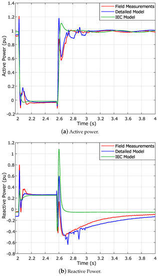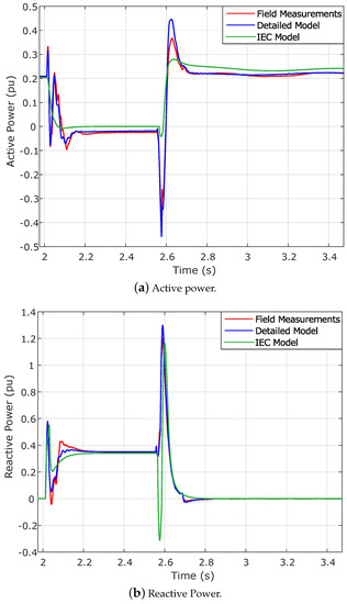 On the other hand, Figure 5 shows the behavior of the active and reactive power during the voltage dip in the three cases analyzed: field test, detailed WT simulation model and IEC generic WT model.