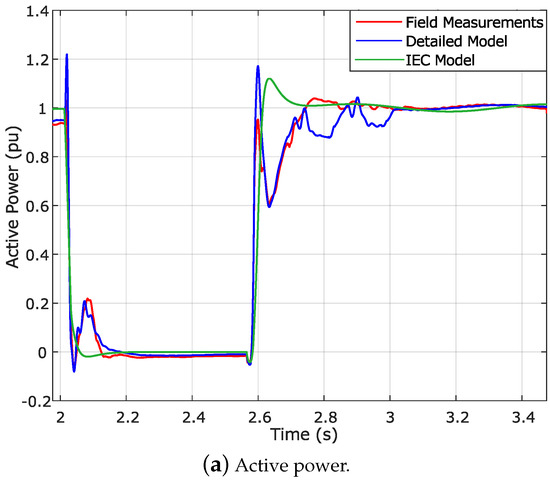 Compliance of the detailed model with PVVC validation criteria is also supported by Figure 5. On the one hand, Figure 5a shows the detailed model’s active power response facing the voltage dip. It can be seen that there is an excellent correlation between this signal and the one provided by the field measurements. The same applies to the reactive power (Figure 5b), the signal of which is also very similar to the field measurements. In this case, transient periods are accurately represented since the detailed WT model considered the actual mechanical, electrical and electronic systems of the Gamesa G52 WT, including their parameters and algorithms.