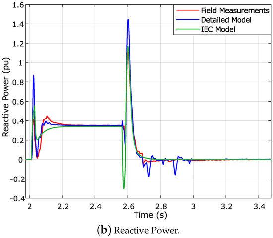 The differences between the field measurements and the IEC model, both in the active and the reactive power responses, which are mainly due to the inability of the generic model to accurately represent the transient periods, are described with great precision in [23]. Indeed, the study summarizes the simplifications implemented in the Type 3A WT model, which is the one modeled in the present work, as explained in Section 3.