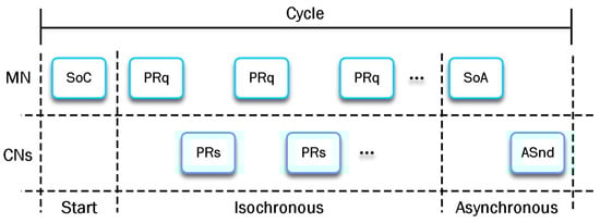 The communication is structured in cycles and two temporal phases can be distinguished within each cycle. The first is a Time Division Multiple Access (TDMA) phase, divided into several time slots. The time slots are equal to the number of CNs, and only one CN can transmit in each slot. The phase begins with a “start of cycle” (SoC) frame, broadcasted by the MN to allow the synchronization of all CNs. Then, each CN responds with “poll response” (PRs) frames to “poll request” (PRq) frames transmitted by the MN. This is a deterministic communication phase that, without collisions, ends with a final broadcast PRs frame sent by MN after all CNs have been serviced. The second phase is an asynchronous communication phase, starts with a “start of asynchronous” (SoA) frame, transmitted by MN to all the nodes. With this message, a single node is enabled to send an “asynchronous send” frame (ASnd) with proper data. An idle phase is interposed between the ASnd and a new SoC in order to fill the remaining cycle time. Figure 1 shows the timing diagram of an EPL communication cycle. The EPL messages contain the message type (SoC, PRq, PRs, SoA, or ASnd), the destination and source node addresses and the payload.