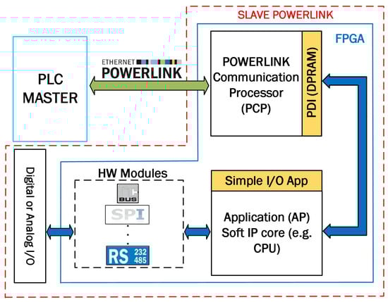 The PLC was provided by B&R and programmed using SIMULINK and B&R automation studio, while Intel FPGA was programmed using Intel Quartus II. In the B&R solution, the POWERLINK Slave can be used in three different configurations: (i) POWERLINK slave with Direct I/O that consists of a POWERLINK Communication Processor (PCP) that can be directly connected to up to 32 I/O lines, (ii) POWERLINK slave with external host processor that consists of an application processor on a dedicated chip and (iii) POWERLINK slave with internal host processor, where the application processor is a Soft IP-Core within the same FPGA as the PCP. SPOF adopts the third configuration, as previously shown in Figure 4.