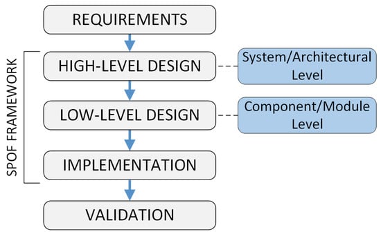 We designed SPOF with the aim of guaranteeing these fulfillments. SPOF is developed with reference to the design flow reported in Figure 3, a simplification of the V-model [28], where starting from requirements, three main steps are done to design a system that satisfies them (high-level and low-level design and implementation). Finally, a validation is done to check if the implemented system satisfies initial requirements. In particular, in the SPOF framework, the final system resulting from the design flow aims to satisfy the typical requirements that exist in an upgrade of equipment in industrial control systems, i.e., (a) to interface old platforms with a different system bus, (b) to interface to one or multiple industrial fieldbuses and (c) to perform some pre-processing on data, such as application of data fusion algorithms. This translates into two main classes of requirements managed by the SPOF framework: