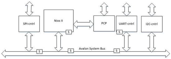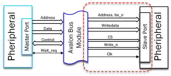 Peripherals and AP communicate by means of an Intel Avalon bus [29]. The bus is a crucial component of the system since it adapts to satisfy the users’ functional requirements. Avalon peripherals can be memories and processors, as well as traditional peripheral components, such as a UART, timers and bus bridges, but even any custom Avalon peripheral. The Avalon bus module is automatically generated by Intel Quartus II tool, avoiding manually connection between bus and peripherals. It automatically generates the arbitration logic and the necessary resizing that allows easily supporting peripherals of different widths. In Figure 5 [29], a detailed view is shown, by means of a block diagram of an Avalon-based system, where the main core is connected to the left side, while slave interfaces are connected to the right.