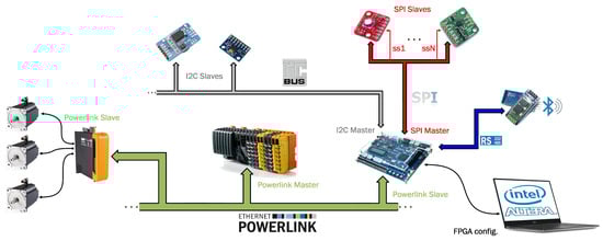 An FPGA, the Intel Cyclone IV EP4CE115F29C7, has been introduced in the control system hardware platform, in order to evaluate implementations provided by the SPOF framework when interfacing to new modules. The Nios II configuration is the Nios II/e. For this test, new modules are represented by different sensors, connected using SPI, I2C and RS232 interfaces: they provide, respectively, ten points of temperature monitoring, twelve accelerators for seismic monitoring and one Bluetooth connection to exchange data with other remote components, as shown in Figure 7. Temperature sensors were already presented in the old equipment, while accelerators and Bluetooth are completely newly added. Sensors have to collect data to communicate them to master node through POWERLINK.