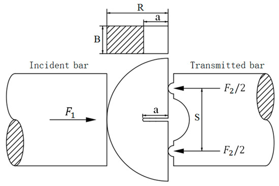 According to the International Society for Rock Mechanics (ISRM) test standard [16], the distance between the two supports of the transmitted bar end was set to S = 55 mm, as shown in Figure 2. The pre-crack dimensionless length was defined as = a/R = 0.2 and the dimensionless support spacing was = S/D = 0.55. By applying a balancing force to the test sample, the pre-crack in the center of the test sample was subjected to mode I fracture. The stress intensity factor of the crack tip in the test sample is given by: