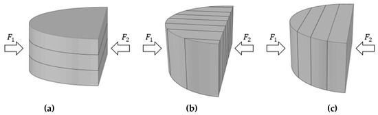 Figure 3 provides a schematic diagram of the three loading modes of the NSCB test sample. According to the relative orientations of the loading direction and the bedding structural plane, three loading modes were tested: (a) Crack-divider (b) Crack-splitter and (c) Crack-arrester. Among them, the (a) and (b) loading direction is parallel to the bedding, and the (c) loading direction is perpendicular to the bedding. Each of the loading modes was tested at four different impact pressures to evaluate the dynamic crack initiation toughness and regular rupture of shale under different pressure gradients. Three effective samples which a achieved dynamic force balance were tested for each pressure gradient, as shown in Figure 4.