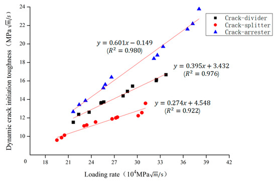 Comparing the three fitting curves in Figure 4 showed that the Crack-splitter had the lowest slope, the slope of the Crack-divider was intermediate, and the Crack-arrester had the maximum slope. The different slopes reflect the loading rate correlation of the samples under different loading conditions. Under Crack-splitter conditions, the strength of the test sample mainly depended on the consolidation between bedding planes. There was no obvious correlation of the loading rate for the consolidation between bedding planes. Under Crack-arrester conditions, the dynamic crack initiation toughness increased significantly with the increase of the loading rate, which indicated that the strength of the shale material played a decisive role. Its regular fracture was consistent with correlations for the loading rates of ordinary rock materials.