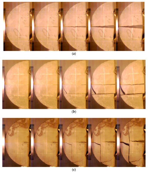 The NSCB samples showed different fracture modes in the three sets of experiments due to the shale bedding plane. Figure 6 displays three typical fracture modes of the specimens, as recorded by a high-speed camera.