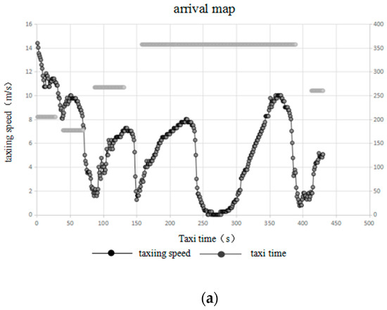 In this paper, we first analyzed taxiing aircrafts’ motion on airport surfaces, and then established the aircraft taxiway path planning model. Figure 1 shows surveillance data covering the movement status of a typical arriving and departing aircraft [5,6], which was used to analyze the motion state of an aircraft on airport surfaces.