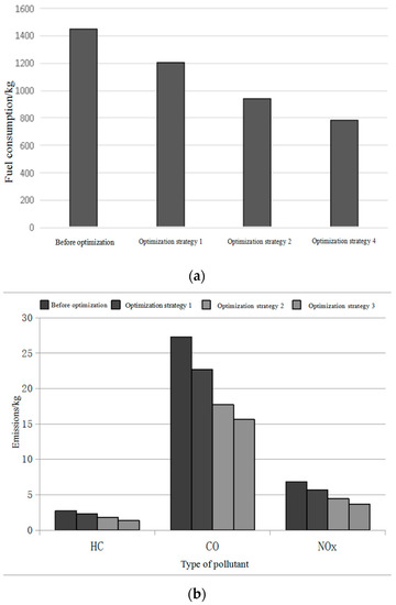 Figure 9. Aircraft fuel consumption (a), and emissions (b) under different optimization strategies.