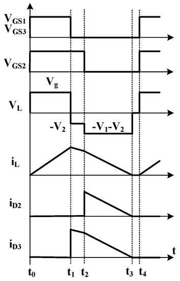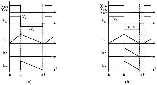 - While all switches are turned off, diodes D1–D3 are all forward-biased as shown in Figure 4c. The energy pre-stored in the inductor is released to batteries, B1 and B2 through three diodes D1–D3. The voltage on the inductor is negative and equal to (−V1 − V2) and the inductor current is then decreased.