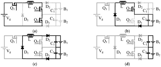 - In this mode, switches Q1 and Q2 are turned on. The equivalent circuit is shown in Figure 4a. Diodes D1 and D2 are reverse-biased and diode D3 is forward-biased. Battery B1 is bypassed to reduce equivalent charging current. The inductor voltage is (Vg − V2) and the inductor current iL is increased. Only battery B2 is charged by inductor current in this mode. This mode is ended while either switch Q1 or Q2 is turned off.