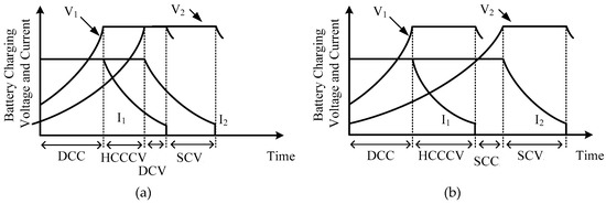 The common CC/CV charging method is used to charge each battery in this study. Voltages and currents of each battery and inductor current are all fed back for charging control. With the assumption of lower SoC in battery B2, two possible charging profiles of the series-connected batteries are shown in Figure 8. Figure 8a shows the charging profile for a small SoC difference between two batteries. In the first region, two batteries are both charged with the constant current, i.e., the dual constant-current (DCC) region. Batteries B1 and B2 are charged with the inductor current in series. Then, battery B1 would firstly be charged into the constant-voltage mode and battery B2 is still charged with the constant current. The second region is the hybrid constant-current constant-voltage (HCCCV) region. Battery B2 is charged into the constant-voltage mode and battery B1 is still in the constant-voltage mode. The converter is operated into the third region, i.e., the dual constant-voltage (DCV) region. In the next region, the charging process of battery B1 is already finished and battery B2 remains to charge in the constant-voltage mode. This region is the single constant-voltage (SCV) region. The whole charging profile of the two series-connected batteries is ended when both batteries B1 and B2 are fully charged.
