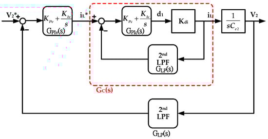 In the past decades, several state averaged models for DCM PWM converters have been proposed [27,28,29,30]. These models can basically be divided into two types, namely the reduced-order models [27,28,30] and full-order models [29,30]. The dynamic of the inductor current in the DCM converter would disappear because of the state averaging procedure in one switching cycle. Therefore, the averaged model becomes a reduced-order model with the remaining dynamic of output capacitor voltage. The dynamic of the converter would become a simple single-pole system. Compared with the full-order models, the reduced-order models can provide good accuracy in low frequency, below about 1/10 switching frequency, as shown in [29]. Although the accuracy of the reduced-order model is limited, the reduced-order model is simpler for designing the controller and should be accurate enough for the battery charging applications with CC/CV charging strategy. The dynamics of the required charging current and voltage commands are relatively slow. Therefore, the reduced-order model is adopted to realize the dynamic of the proposed converter and design of the controller parameters.