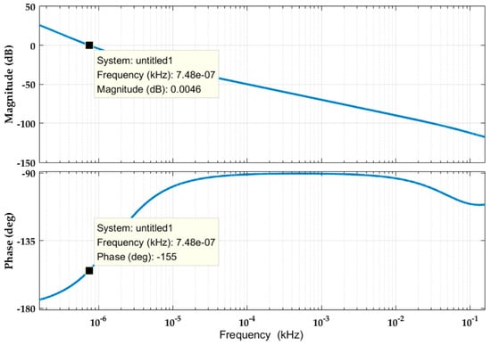 According to Equations (16)–(19), the dual-loop controller of each battery as shown in Figure 9 can then be further illustrated in Figure 10. The currents and voltages are feedback with second-order low pass filters (LPFs). The corner frequency of the filters is designed to 2 kHz. The current loop proportional-integral controller is set with KPc = 0.1 and KIc = 100. In the voltage loop, the parameters are set to KPv = 2 and KIv = 0.02. The current loop gain is KdiGPIcGLP and the corresponding bode plot is shown in Figure 11. Then, the voltage loop gain becomes GPIvGLP[KdiGPIc/(1 + Kdi GPIcGLP)] and the corresponding bode plot is shown in Figure 12. From the bode plots, it can be seen that the gain margin and phase margin are enough for stabilizing the system. The bandwidth of the voltage control loop is very low because of the large equivalent capacitance of the battery.