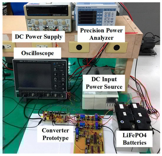 The test setup of the constructed prototype is shown in Figure 13. To ensure the measuring precision, a WT330 precision power analyzer (Yokogawa, Tokyo, Japan) is used for accurate efficiency measurement of the proposed converter. The efficiency is calculated with the voltamperometric method. The relative voltage and current waveforms are measured by a 24Xs-A digital oscilloscope (Lecroy, Chestnut Ridge, NY, USA).