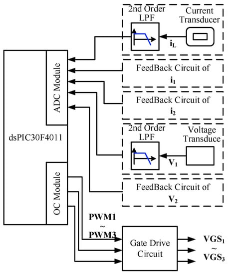Figure 14 shows the schematic diagram of the controller. A microcontroller dsPIC30F4011 is used to implement the control strategy shown in the previous section digitally. Currents iL, i1 and i2 and voltages V1 and V2 are transduced to analog signals with three current transducers and two voltage transducers, respectively. A 2nd order LPF is used to filter out the high-frequency ripple components. Then, all current and voltage feedback signals are converted into digital data via the analog to digital converter (ADC) module. The corresponding PWM signals for the three active switches are then generated via the output compare (OC) module. The PWM signals would then be delivered to the MOSFET driver circuit for providing the driving voltages VGS1–VGS3 to the three switches.