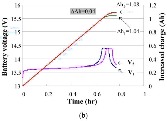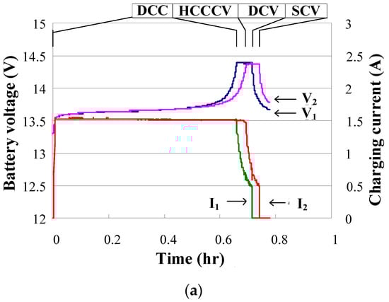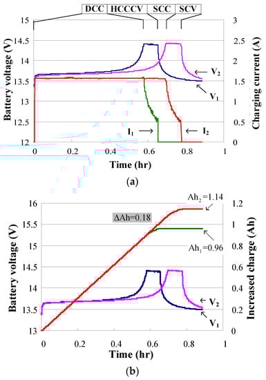 Figure 16 shows the results of charging experiment of two batteries with small SoC difference. In the measured waveforms of voltages and currents shown in Figure 16a, the third charging region is the DCV region. In this region, the voltage of battery B2 is increased to the rated charging voltage before the charging process of battery B1 is finished. From the measured data of increased charge shown in Figure 16b, it can be seen that the charge difference is only about 0.04 Ah.