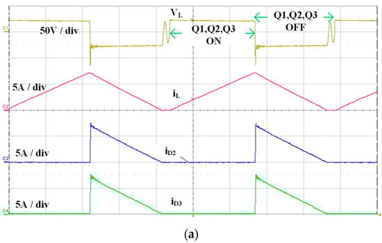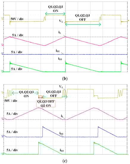 The waveforms of the converter operated at 120 V input voltage condition, i.e., the step-down operation mode, are shown in Figure 17. Figure 17a shows the waveforms of the DCC region with 25 V battery pack voltage and 1.5 A charging current. Figure 17b shows the waveforms of the SCC region with 13 V single battery voltage and 1.5 A charging current. In the DCC and SCC regions, only switch Q1 is activated to control the charging current. Figure 17c shows the waveforms of the HCCCV region with battery voltages, V1 = 14.4 V and V2 = 12.3 V, and charging currents, I1= 1 A and I2= 1.5 A. In this region, switch Q2 is activated to reduce the charging current for battery B1.