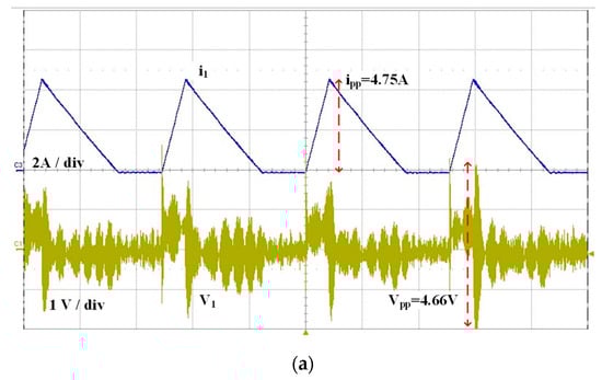 From the measured diode currents iD1 and iD2, it can be seen that there are significant current ripple components. To prevent the batteries from damage by the high-frequency current ripple components, three kinds of capacitors are connected to the output terminals of the proposed converter. Figure 19 shows the output voltage ripple and output current with different kinds of capacitors at 1.5 A averaged output current. The output voltage ripple is measured with AC coupling function of the oscilloscope. The output current ripple can be greatly reduced by adding suitable capacitors.