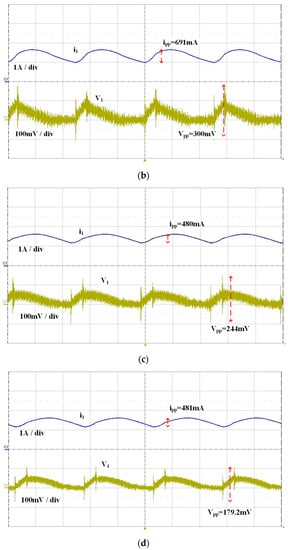 The total effective ESR at the output terminal can be reduced by adding an aluminum solid capacitor. The MLCC is used to attenuate the high-frequency noise. From the measured waveforms in Figure 19d, it can be seen that the peak to peak current is greatly reduced to 480 mA. Compared with the measured waveforms without additional capacitors shown in Figure 19a, the current ripple is greatly reduced to only about 10%.