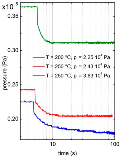As reported in Figure 1, the acquisition of data starts at a constant pressure, which is the initial value of p, pi, imposed in the reservoir. At a certain time, the valve connecting the gas reservoir with the initially pumped sample holder is opened. Correspondingly, the pressure abruptly drops, due to the change of volume of the gas. After about 0.3 s, the pressure smoothly decreases as the sample starts to absorb hydrogen. For longer times, the pressure becomes constant and from the measure of the total pressure (ΔpTOT), it is possible to assess the final hydrogen content in the solid sample (H/M). In Figure 1, one can observe that increasing the temperature, starting from similar values of p, the kinetics becomes faster as less time is needed to reach the steady state. However, it must be noted that the pressure drop at lower T is higher, in agreement with the higher hydrogen content measured at lower temperatures by the pressure–composition isotherms [27]. Moreover, considering the curves measured at the sample temperature of 250 °C starting with different pressures, one can note a faster kinetics at higher p. This behavior is the one expected for metal hydrides. In conclusion, the hydrogen kinetics curves show the expected behavior. In the following, we will use these data to evaluate quantitatively the diffusion coefficient of hydrogen into the Pd–Ag alloy, introducing an innovative procedure.