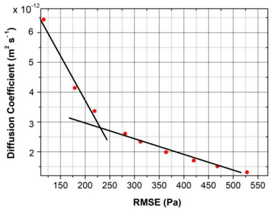 Relation between the root mean square error(RMSE) and the diffusion coefficient calculated for test #7 (T = 150 °C and pi= 10,390 Pa).