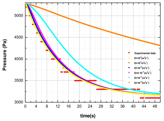 It was observed that starting with a low diffusion coefficient, the curve of the pressures numerically assessed (pnum) vs. time does not overlap with the experimental pressure (pexp) values. As the diffusion coefficient is increased in the code, the numerical and the experimental pressure curves vs. time become closer and the RMSE linearly decreases.