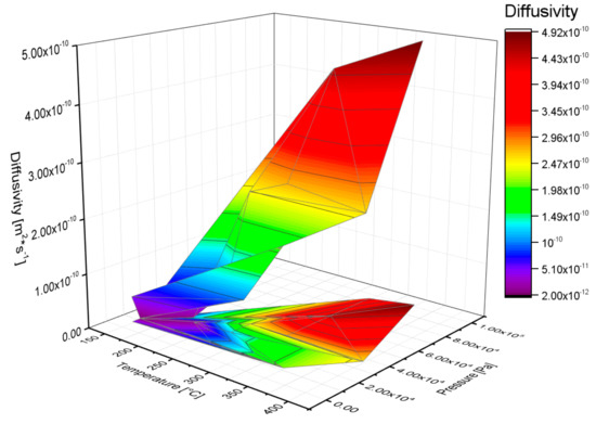 However, above a certain value of the diffusion coefficient, the RMSE reduces less quickly. From a physical point of view this means that when low diffusion coefficients are considered, the limiting step in the overall absorption–diffusion process is the diffusion through the metal lattice, while in the case of high diffusion coefficients, the limiting step becomes the hydrogen absorption on the sample surface. The latter situation cannot be precisely simulated with the described numerical procedure. For this reason, the diffusion coefficient assessed in each absorption test is the one corresponding to the intersection of the two RMSE interpolation lines (see Figure 3). Particularly for each experiment (i.e., hydrogen absorption at selected p and T), 11 evaluations of the diffusion coefficient were performed by varying the RMSE. According to the consideration previously explained, the final diffusion coefficients assessed with the code, and illustrated in Figure 5, represent from a physical point of view the lower limit of the real diffusion coefficient. Figure 5 reports the behavior of the diffusion coefficient evaluated by the numerical code as a function of the temperature of the specimen and of the initial pressure. It clearly shows that the calculated diffusion coefficient increases as p or T increases, in agreement with experimental findings. Indeed, the calculated values of the diffusion coefficients are reported in Table 1.