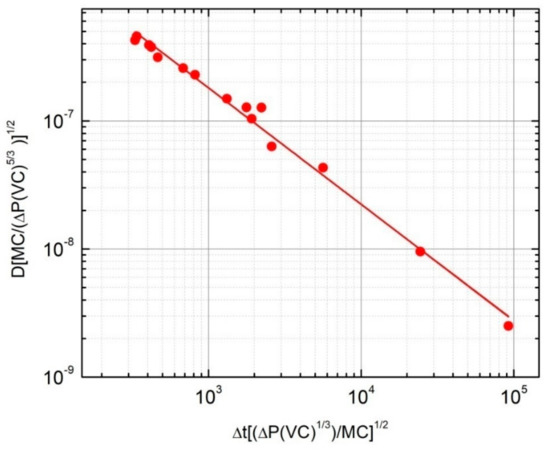 The above equation reveals that for a sample having a mass, MC, and a volume, VC, there is a certain function () among the diffusion coefficient (D), the time required by the absorption process (Δt), and the pressure drop (ΔP) registered during the absorption experiment. In particular, by using the experimental data illustrated in Section 3.1 and a logarithmic representation, the function, , has a linear behaviour as shown in Figure 6 and its analytical solution is: