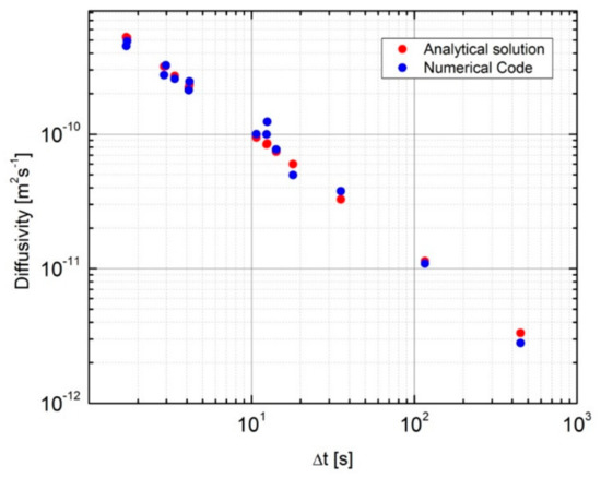 Figure 7 displays in a logarithmic scale the comparison between the diffusivity coefficients assessed via the numerical code described in Section 3.2 with the analytical solution of the dimensional analysis. One can note the very good agreement between the values of the hydrogen diffusion coefficients assessed by the two procedures.