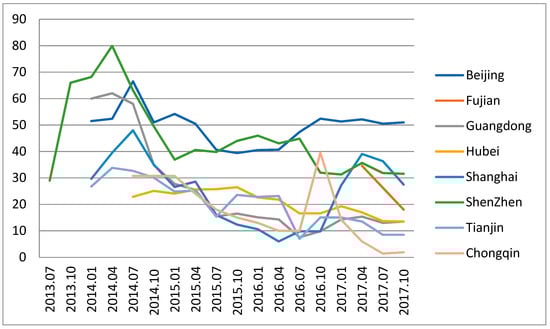 Quota price in first trading day of each quarter during 2013 to 2017 in Chinese ETS pilots [55].