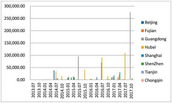 At present, the carbon quota trading prices of the eight carbon trading pilot-projects in China are quite different [28], showing a trend of drastic fluctuation and decline (see Figure 1). The pilot trading prices of the pilot projects are concentrated mostly within the price range of 10–50 yuan; Beijing and Shenzhen have relatively high transaction prices, Chongqing has the lowest transaction price, the pilot trading prices of Shenzhen and Guangdong fluctuate considerably, the pilot trading price of Hubei shows the most stable trend, and the future trend of carbon quota transaction prices in various pilot areas is unclear [18,46]. From the perspective of trading volume, the performances of the pilot projects in Guangdong and Hubei are obviously better than are those of other pilot projects, some pilot projects even have zero trading volume [54], and the concentration of the time points of the trading is also heterogeneous among various pilot projects (see Figure 2). The total volume of carbon trading of the three pilot projects in Hubei, Guangdong, and Shenzhen accounts for more than 70% of the national carbon market trading (see Figure 3), which is obviously superior to that of the other pilot projects [45]. Therefore, the development of various carbon trading pilot-projects in China is obviously unbalanced, showing the significant regional difference, and the overall market trading mechanism is ineffective [38]. The huge difference in the transaction price and trading volume of carbon quota is likely to bring about the risk of carbon leakage and make it more difficult for the national carbon market to realize the trading among various pilot projects and between the pilot projects and the central government.
