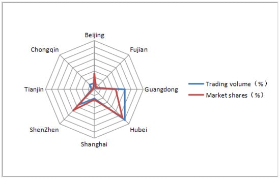 Distribution of carbon trading volume and carbon trading market shares for each pilot [55].