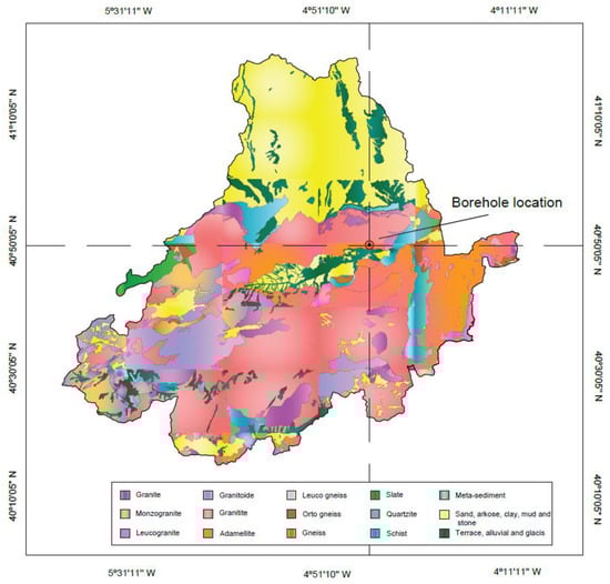 The area contemplated in the present research is located in the center of Ávila (Spain). This region is geologically constituted by two main blocks. One of them is defined by igneous and metamorphic rocks from the Upper Carboniferous-Low Permian and Pre-Cambrian-Low Cambrian periods, respectively. The second block is characterized by the presence of sedimentary materials from the Mesozoic, Tertiary and Quaternary (oriental area of the Amble’s valley) periods [,]. In the case of the volume of ground considered here, it belongs to granite formations and more specifically, adamellite rocks. This information can be deduced from the geological map of the region presented in Figure 1.