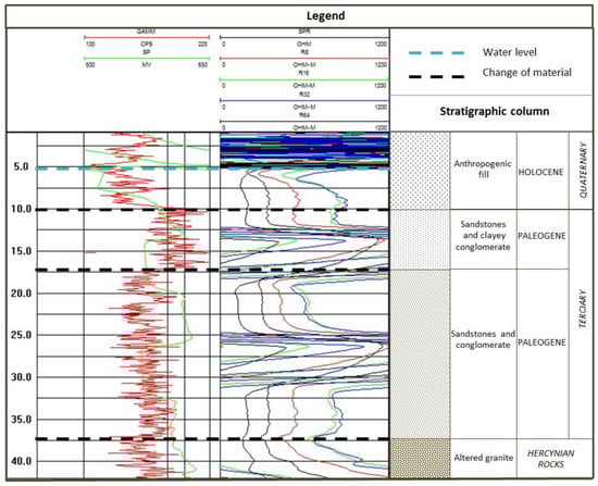 For a more precise geological characterization, geophysical tests were applied on the experimental borehole. A well logging system was used to obtain the specific earth information. It consists of the measuring of continuous and simultaneous record of different physical parameters throughout the borehole column. The equipment used for the mentioned purpose utilizes a series of interchangeable multi-parameter sensors that allowed to register the following parameters: spontaneous potential, resistivity, and natural gamma radiation. Figure 2 includes the register of the well logging test applied on the study borehole and the stratigraphic column derived from its interpretation.