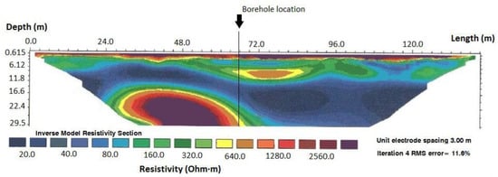 To apply Equation (2), the electrical resistivity of the materials in the study area must be known. To this end, an ERT test was conducted around the mentioned area, obtaining a 2D electrical resistivity section (presented in Figure 6).
