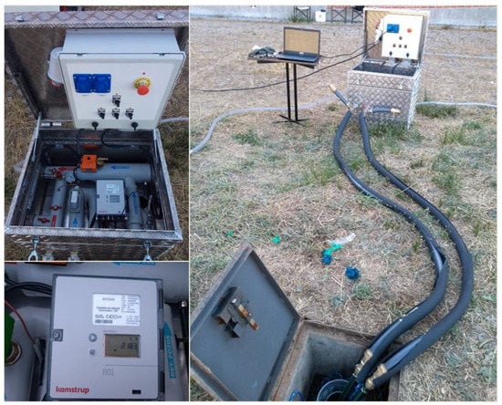 In this research, TRT was done according to UNE-EN ISO 17628:2017 regulations []. The TRT device implemented here constituted of a heat injection system, a circulating pump, and electrical resistance as heat source. The resistance allows three different heating levels, corresponding to the injection of 3 kW (stage 1), 6 kW (stage 2), and 9 kW (stage 3). The TRT equipment also included a Kamstrup energy meter (to register a large number of parameters), commercially known as MULTICAL 801.