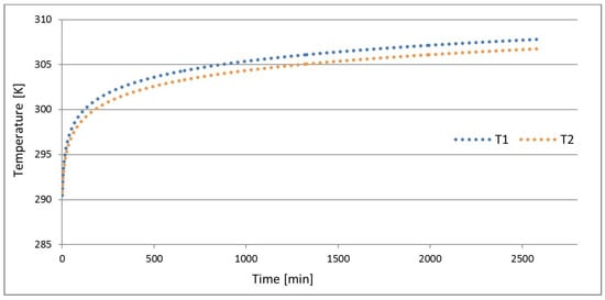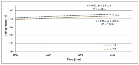 On observing Figure 9, we note that the slope of the linear approximation is the same for T1 and T2, such that the calculation of the thermal conductivity parameter is identical for both cases. When applying Equation (4), the following values were considered: b = 0.0015 min, H = 43 m and Q = 1.875 kW/min (resistance first stage (3000 kW)/time of the linear approximation (1600 min)). Thus, the global thermal conductivity of the borehole from TRT results takes a value of 2.313 W/mK.