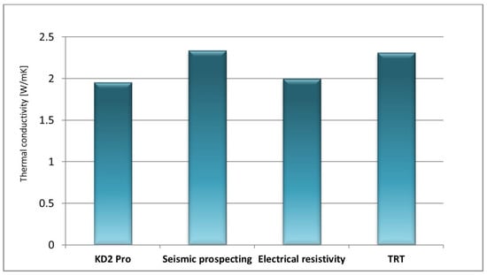 It is thus convenient to include the accuracy error of each of the methodologies shown in Figure 10: 10% for KD2 Pro, 14.2% for seismic prospecting, 16.7% for electrical resistivity, and 5% for TRT [,,,].