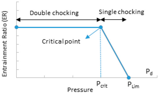 Figure 1 shows the performance curve of an ejector. The ejectors may work under double choking or single choking other than the critical point based on the operating conditions. The back pressure that gives the maximum entrainment ratio refers to the critical point. Under double choking conditions, both the primary and the secondary flows are choked and the entrainment ratio is constant while the back pressure decreases. Under single choking conditions, the secondary flow is not choked and the entrainment ratio decreases with increasing the back pressure [