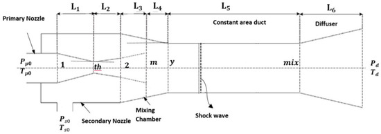 0) into the mixing section. Inside the mixing section, the two streams exchange momentums and energies and then the mixture compresses to a pressure higher than the secondary inlet pressure (P