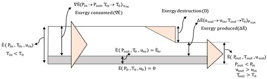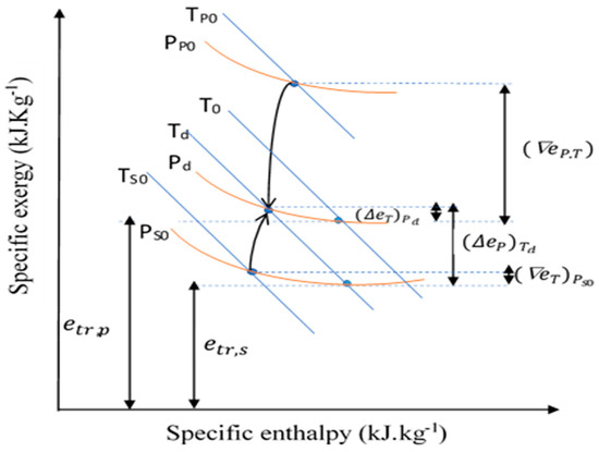 The first term of exergy produced, represents the increase of the specific thermal exergy due to the temperature drop of primary flow from T0 to Td under constant pressure Pd. The second term represents the increase in the mechanical exergy component of the secondary flow due to the pressure rise from Ps0 to Pd at constant temperature Td.