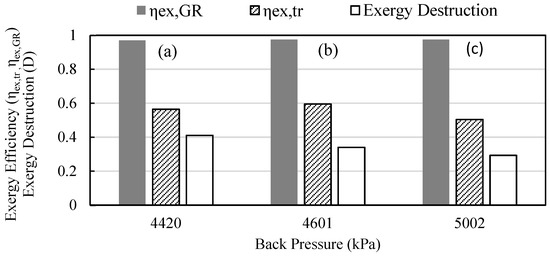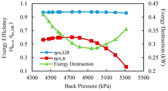 ex,tr remained within the range 0.564–0.595. The minimum exergy destruction (0.34 kW) took place at the critical back pressure (4601 kPa).