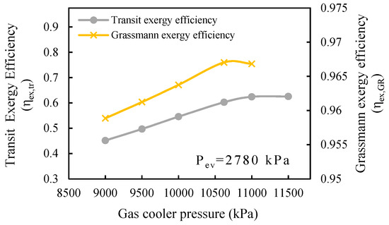 Figure 8, there existed a maximum exergy efficiency corresponding to an optimum gas cooler pressure. The optimal gas cooler pressure was about 11,000 kPa, which was almost the same as that corresponding to the COP obtained in the authors’ previous work [